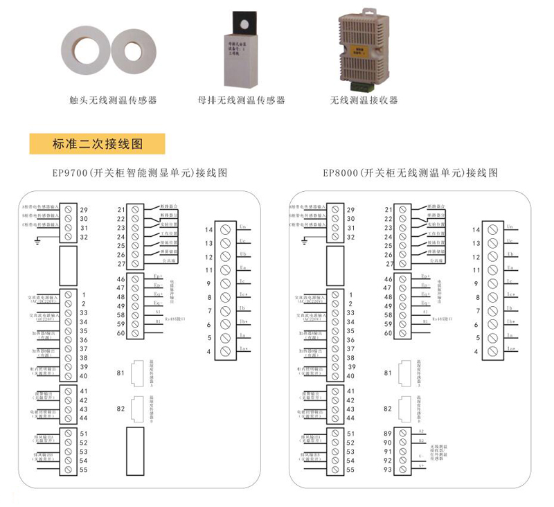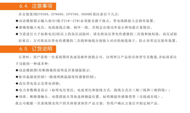 EP9700不僅具有動態(tài)模擬圖、柜內(nèi)溫濕度數(shù)字顯示及可編程控制、語音防誤提示、帶電顯示及閉鎖、操控轉(zhuǎn)換開關(guān)(包括儲能開關(guān)、遠方/就地轉(zhuǎn)換開關(guān)、分合閘轉(zhuǎn)換開關(guān))、RS485數(shù)字通訊等功能,其還集成了多功能電能表的全部功能,可同時測量顯示多種電力參數(shù):三相電壓、三相電流、有功功率、無功功率、功率因數(shù)、頻率,并計量有功電能和無功電能。EP9800除了具有EP9700所有功能外, 另可與位置無線測溫傳感器或遠紅外有線測溫傳感器配合使用, 可在線測量母排、斷路器觸頭、電纜搭接頭等多處實時溫度。